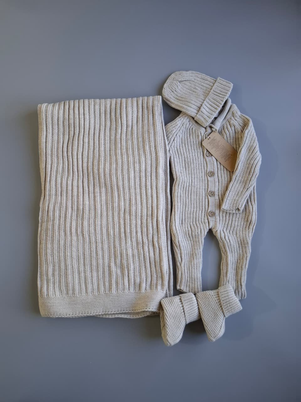 From the cozy onesie to the delicately knitted hat, our beige wool baby set is as practical as it is beautiful. The included blanket doubles up as a soft wrap for naps and cuddle time, ensuring your baby stays warm and happy wherever you go. The baby socks provide a touch of cuteness while keeping tiny toes toasty, and the hat offers additional warmth to protect sensitive little ears. Whether for daily use or special occasions, each piece in this set reflects simple sophistication and functionality.